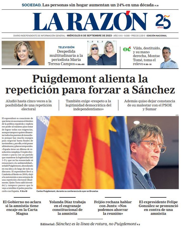 LA RAZÓN: "Puigdemont alienta la repetición para forzar a Sánchez".