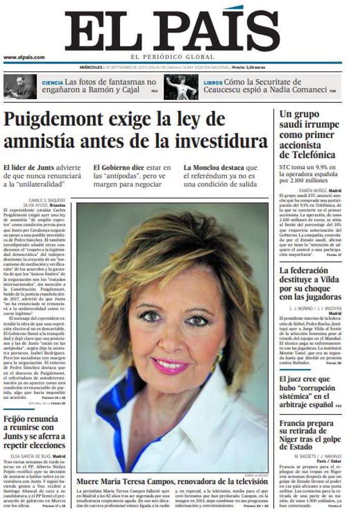 EL PAÍS: "Puigdemont exige la ley de amnistía antes de la investidura"; "Feijóo renuncia a reunirse con Junts y se aferra a repetir elecciones"; "Muere María Teresa Campos, renovadora de la televisión"; "Un grupo saudí irrumpe como primer accionista de Telefónica"; "La federación destituye a Vilda por su choque con las jugadoras"; "El juez cree que hubo "corrupción sistémica" en el arbitraje español"; "Francia prepara su retirada de Níger tras el golpe de Estado".