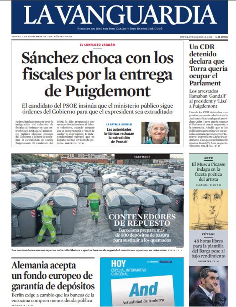 LA VANGUARDIA: "Sánchez choca con los fiscales por la entrega de Puigdemont"; "Un CDR detenido declara que Torra quería ocupar el Parlament"; "Alemania acepta un fondo europeo de garantía de depósitos"; "Contenedores de repuesto"; "El Museu Picasso indaga en la faceta poética del artista"; "48 horas libres para la plantilla del Barça pese al bajo rendimiento".