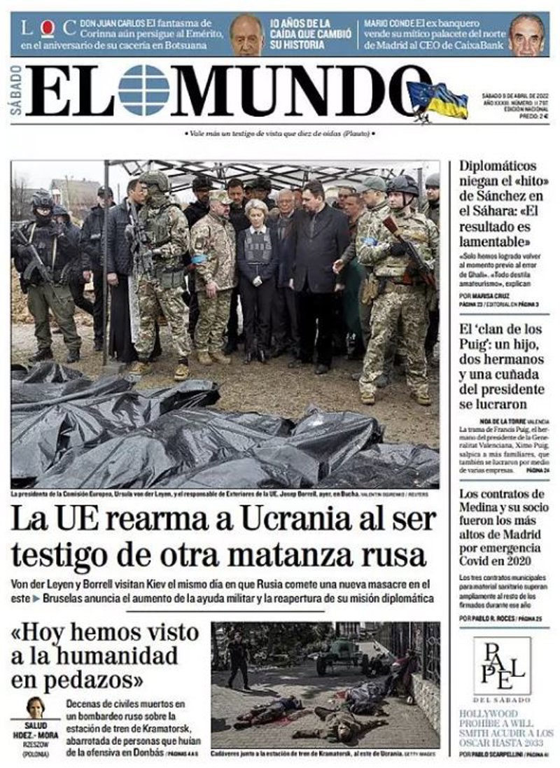 EL MUNDO: "La UE rearma a Ucrania al ser testigo de otra matanza rusa"; ""Hoy hemos visto a la humanidad en pedazos""; "Diplomáticos niegan el "hito" de Sánchez en el Sáhara: "El resultado es lamentable""; "El 'clan de los Puig': un hijo, dos hermanos y una cuñada del presidente se lucraron""; "Los contratos de Madrid y su socio fueron los más altos de Madrid por emergencia Covid en 2020".