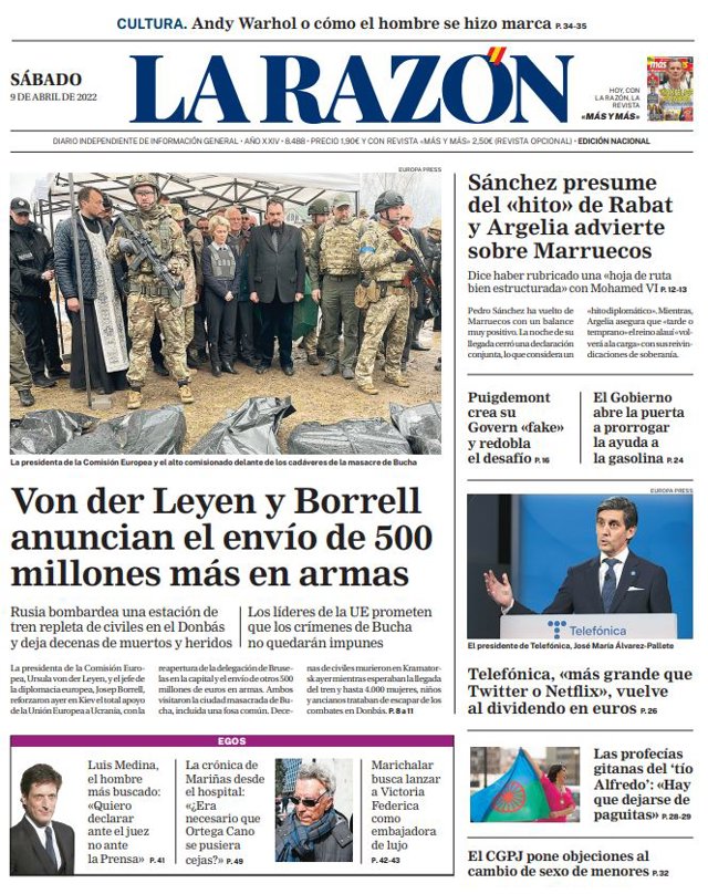 LA RAZÓN: "Von der Leyen y Borrell anuncian el envío de 500 millones más en armas"; "Sánchez presume del "hito" de Rabat y Argelia advierte sobre Marruecos"; "Puigdemont crea su Govern "fake" y redobla el desafío"; "El Gobierno abre la puerta a prorrogar la ayuda a la gasolina"; "Telefónica, "más grande que Twitter o Netflix", vuelve al dividendo en euros"; "Las profecías gitanas del 'tío Alfredo': "Hay que dejarse de paguitas""; "El CGPJ pone objeciones al cambio de sexo de menores".