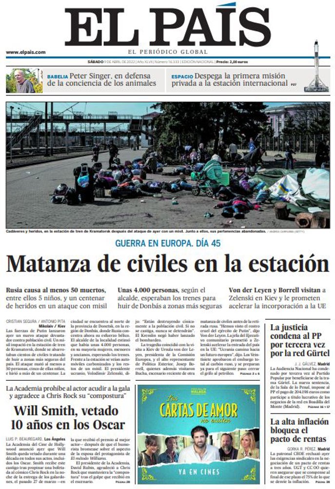 EL PAÍS: "Matanza de civiles en la estación"; "Will Smith, vetado 10 años en los Oscar"; "La justicia condena al PP por tercera vez por la red Gürtel"; "La alta inflación bloquea el pacto de rentas".