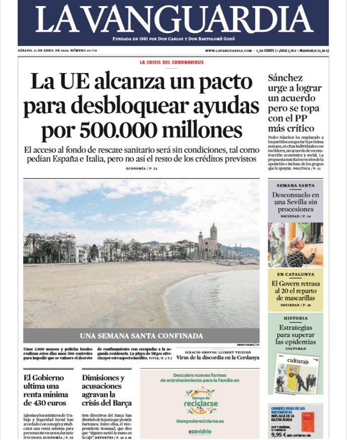 LA VANGUARDIA: "La UE alcanza un pacto para desbloquear ayudas por 500.000 millones"; "Sánchez urge a lograr un acuerdo pero se topa con el PP más crítico"; "El Gobierno ultima una renta mínima de 430 euros"; "Dimisiones y acusaciones agravan la crisis del Barça".