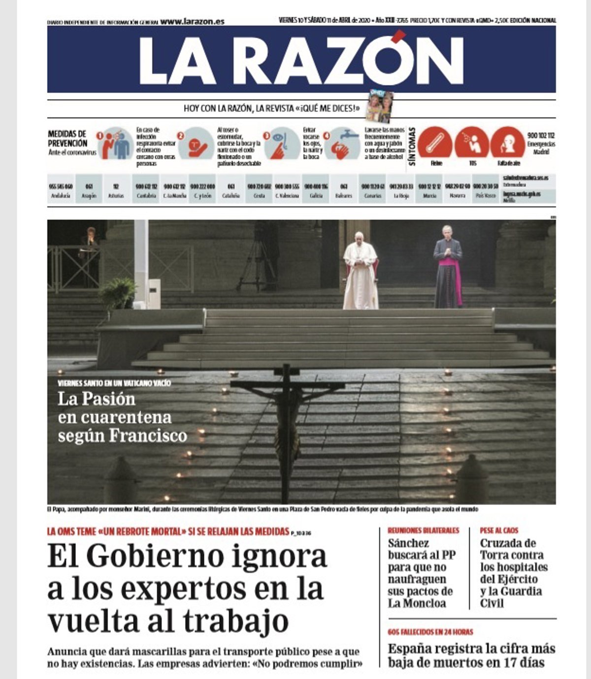 LA RAZÓN: "El Gobierno ignora a los expertos en la vuelta al trabajo"; "La Pasión en cuarentena según Francisco"; "Sánchez buscará al PP para que no naufraguen sus pactos de La Moncloa"; "Cruzada de Torra contra los hospitales del Ejército y la Guardia Civil"; "España registra la cifra más baja de muertos en 17 días".