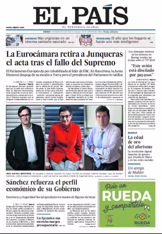 EL PAÍS: "La Eurocámara retira a Junqueras el acta tras el fallo del Supremo"; "Sánchez refuerza el perfil económico de su Gobierno. Un Ejecutivo con estrecho margen presupuestario"; ""Este avión está diseñado por payasos". Los mensajes internos de los técnicos de Boeing revelan las dudas sobre el 737 MAX"; "La edad del oro del aforismo".