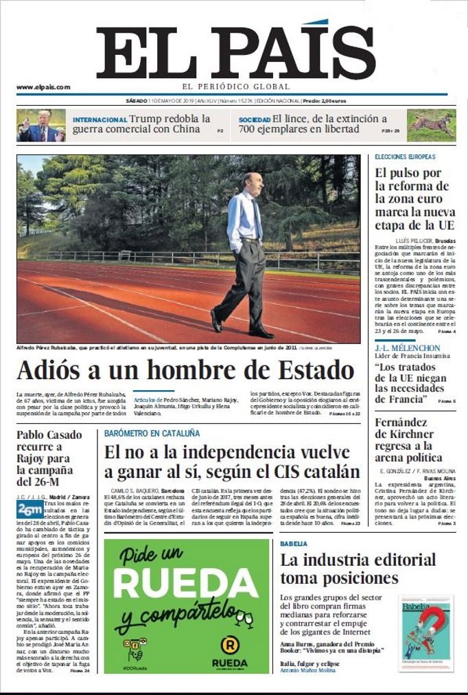 EL PERIÓDICO: "La democracia llora a Rubalcaba. La muerte del político socialista a los 67 años cubre de luto la campaña"; "El recuento electoral de la Cambra no cuadra por 2.462 votos"; "Los fabricantes reclaman en el Automobile leyes homogéneas"; "Trump agrava la guerra comercial con China al elevar los aranceles"; "Penélope Cruz, reina del festival de San Sebastián".