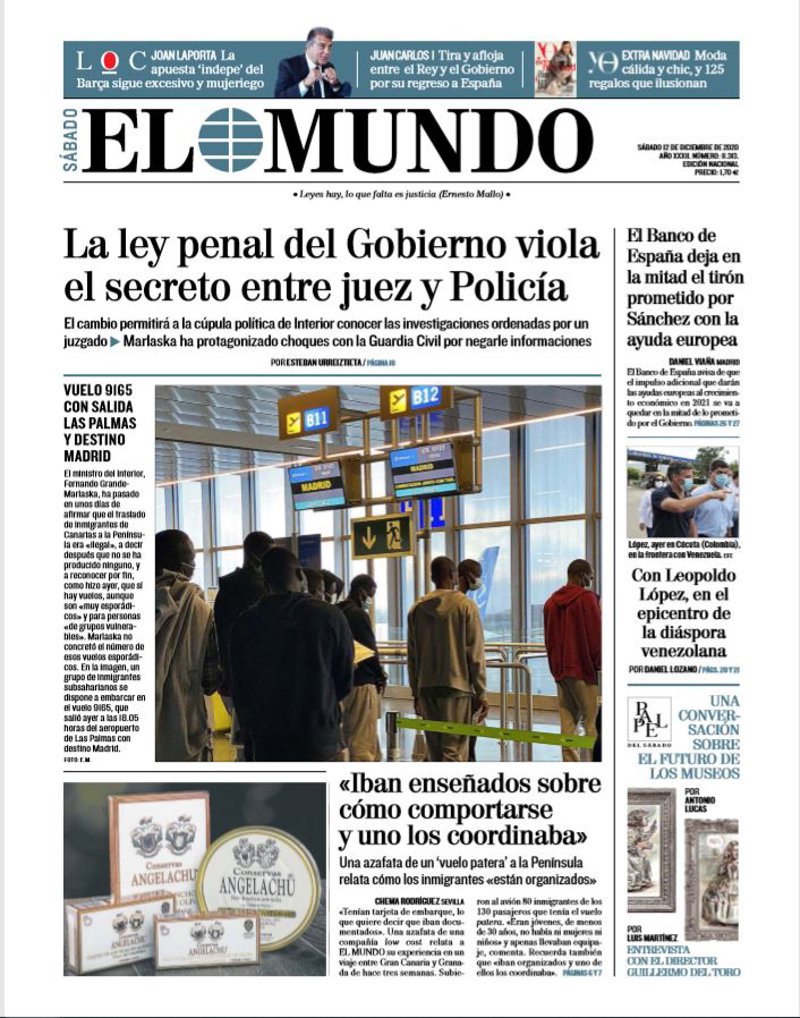 EL MUNDO: "La ley penal del Gobierno viola el secreto entre juez y Policía"; "Vuelo 9165 con salida Las Palmas y destino Madrid. "Iban enseñados sobre cómo comportarse y uno los coordinaba". Una azafata de un 'vuelo patera' a la Península relata cómo los inmigrantes "están organizados""; "El Banco de España deja en la mitad el tirón prometido por Sánchez con la ayuda europea"; "Con Leopoldo López, en el epicentro de la diáspora venezolana".