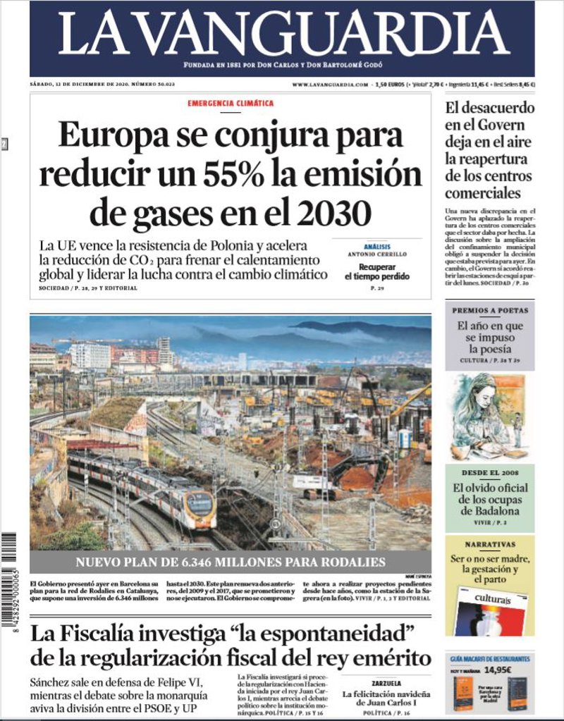 LA VANGUARDIA: "Europa se conjura para reducir un 55% la emisión de gases en el 2030"; "Nuevo plan de 6.346 millones para Rodalies"; "La Fiscalía investiga "la espontaneidad" de la regularización fiscal del rey emérito. La felicitación navideña de Juan Carlos I"; "El desacuerdo en el Govern deja en el aire la reapertura de los centros comerciales".