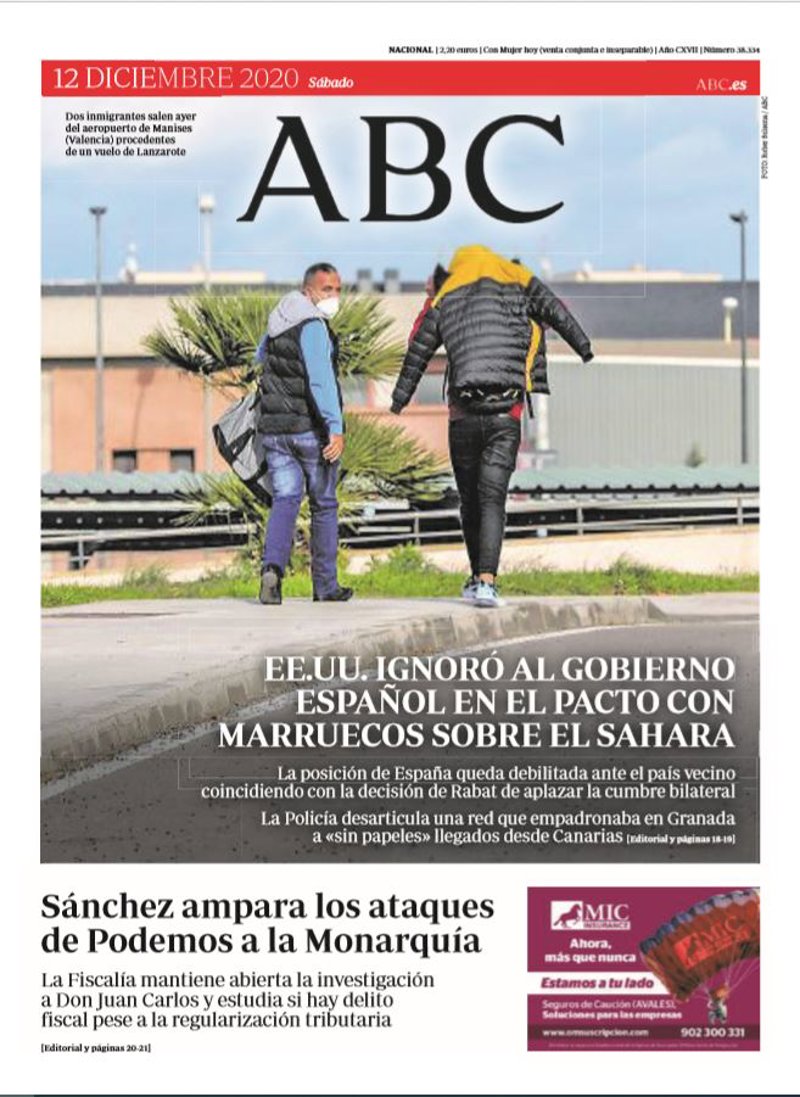 ABC: "EE.UU. ignoró al Gobierno español en el pacto con Marruecos sobre el Sahara. La posición de España queda debilitada ante el país vecino coincidiendo con la decisión de Rabat de aplazar la cumbre bilateral. La Policía desarticula una red que empadronaba en Granada a "sin papeles" llegados desde Canarias"; "Sánchez ampara los ataques de Podemos a la Monarquía. La Fiscalía mantiene abierta la investigación a Don Juan Carlos y estudia si hay delito fiscal pese a la regularización tributaria".