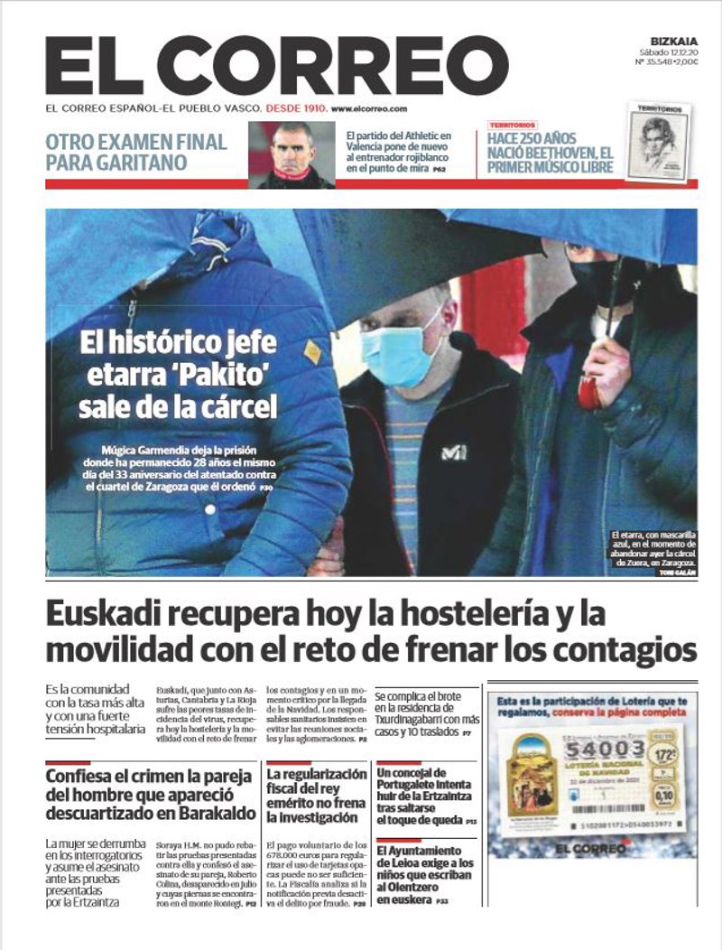 EL CORREO: "El histórico jefe etarra 'Pakito' sale de la cárcel. Múgica Garmendia deja la prisión donde ha permanecido 28 años el mismo día del 33 aniversario del atentado contra el cuartel de Zaragoza que él ordenó"; "Euskadi recupera hoy la hostelería y la movilidad con el reto de frenar los contagios"; "Confiesa el crimen la pareja del hombre que apareció descuartizado en Barakaldo"; "Un concejal de Portugalete intenta huir de la Ertzaintza tras saltarse el toque de queda"; "El Ayuntamiento de Leioa exige a los niños que escriban al Olentzero en euskera".