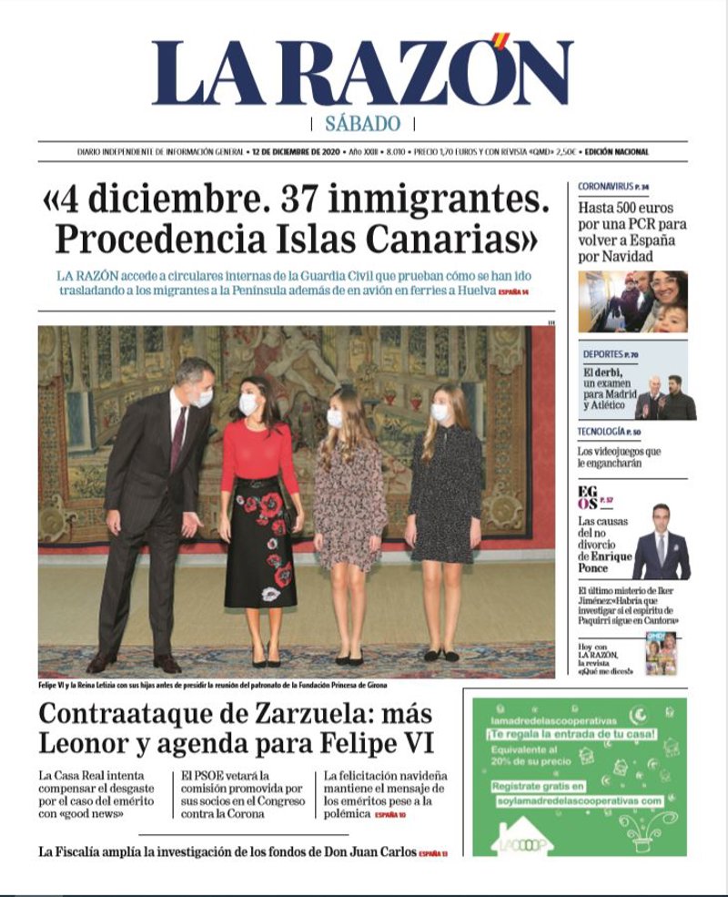 LA RAZÓN: ""4 diciembre. 37 inmigrantes. Procedencia Islas Canarias". La Razón accede a circulares internas de la Guardia Civil que prueban cómo se han ido trasladando a los migrantes a la Península además de en avión en ferries a Huelva"; "Contraataque de Zarzuela: más Leonor y agenda para Felipe VI. La Fiscalía amplía la investigación de los fondos de Don Juan Carlos"; "Hasta 500 euros por una PCR para volver a España por Navidad".