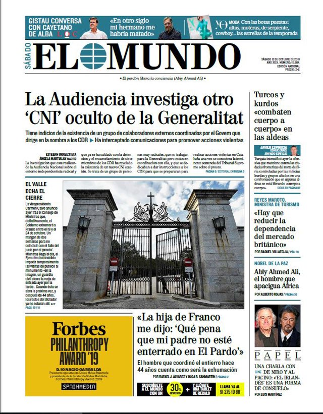 EL MUNDO: "La Audiencia investiga otro 'CNI' oculto en la Generalitat. Tiene indicios de la existencia de un grupo de colaboradores externos coordinados por el Govern que dirige en la sombra a los CDR"; "El Valle echa el cierre. El hombre que coordinó el entierro hace 44 años cuenta como será la exhumación: "La hija de Franco me dijo: ¡Qué pena que mi padre no esté enterrado en El Pardo'""; "Turcos y kurdos "combaten cuerpo a cuerpo" en las aldeas"; "Reyes Maroto, ministra de Turismo: "Hay que reducir la dependencia del mercado británico""; "Nobel de la Paz. Abiy Ahmed Ali, el hombre que apacigua África".