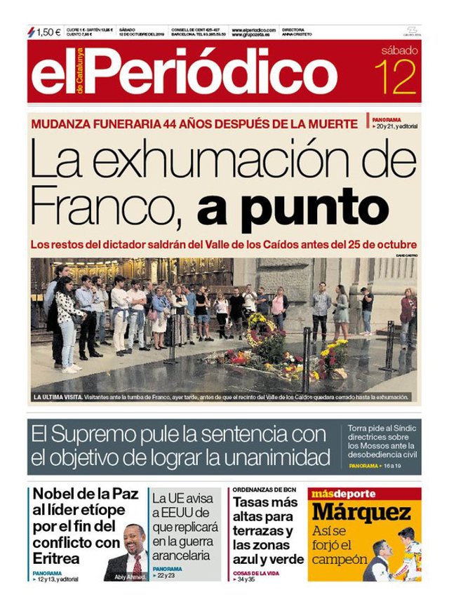 EL PERIÓDICO: "La exhumación de Franco, a punto. Los restos del dictador saldrán del Valle de los Caídos antes del 25 de octubre"; "El Supremo pule la sentencia con el objetivo de lograr la unanimidad"; "Nobel de la Paz al líder etíope por el fin del conflicto en Eritrea"; "La UE avisa a EEUU de que replicará en la guerra arancelaria"; "Tasas más altas para terrazas y las zonas azul y verde".