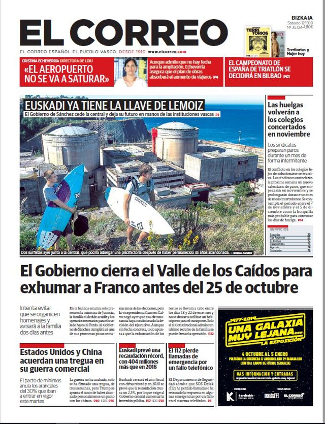 EL CORREO: "Euskadi ya tiene la llave de Lemoz. El Gobierno de Sánchez cede la central y deja su futuro en manos de las instituciones vascas"; "El Gobierno cierra el Valle de los Caídos para exhumar a Franco antes del 25 de octubre"; "Las huelgas volverán a los colegios concertados en noviembre"; "Estados Unidos y China acuerdan una tregua en su guerra comercial"; "Euskadi prevé una recaudación récord, con 404 millones más que en 2018"; "El 112 pierde llamadas de emergencia por un fallo telefónico".
