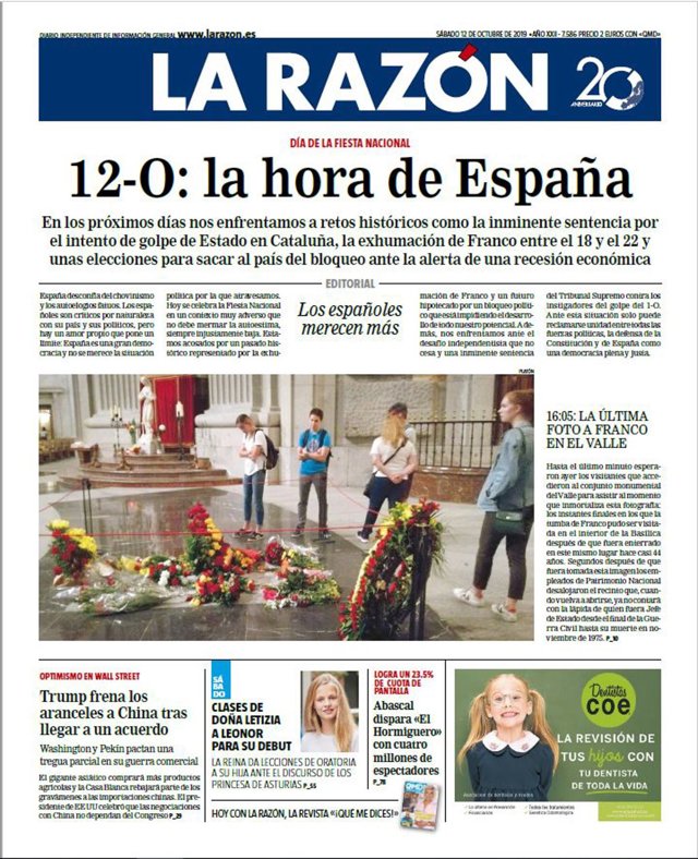LA RAZÓN: "12-O: la hora de España. En los próximos días nos enfrentamos a retos históricos como la inminente sentencia por el intento de golpe de Estado en Cataluña, la exhumación de Franco entre el 18 y el 22 y unas elecciones para sacar al país del bloqueo ante la alerta de una recesión económica"; "Trump frena los aranceles a China tras llegar a un acuerdo"; "Abascal dispara "El Hormiguero" con cuatro millones de espectadores".