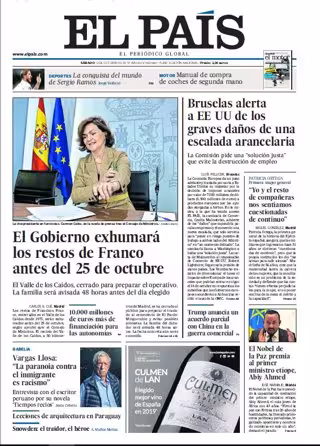 EL PAÍS: "El Gobierno exhumará los restos de Franco antes del 25 de octubre. 10.000 millones de euros más de financiación para las autonomías"; "Bruselas alerta de los graves daños de una escalada arancelaria"; "Patricia Ortega, primer mujer general: "Yo y el resto de compañeras no sentíamos cuestionadas de continuo""; "El Nobel de la Paz premia al primer ministro etiope, Abiy Ahmed"; "Vargas Llosa: "La paranoia contra el inmigrante es racismo"".