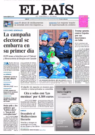 EL PAÍS: "La campaña electoral se embarra en su primer día. El PP ataca a Sánchez por el "Falcon" y Rivera entra el choque con Casado"; "Los argelinos desafían al jefe del Ejército"; "Cita a solas con 'Las meninas' por 4.308 euros. El alquiler de espacios en museos para eventos y visitas privadas se consolida"; "Trump apunta contra España por sus inversiones en Cuba"; "Gobernar ya no es un vicio solitario"; "El PSOE propone un impuesto de sucesiones común en España"; "Ciudadanos aboga por blindar competencias del Estado"; "Botín pide a los políticos que "hablen claro" y "huyan del cortoplacismo"".