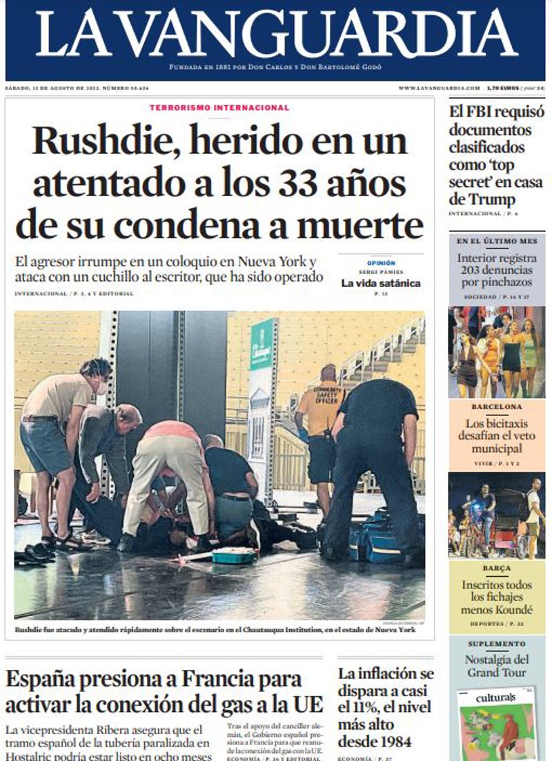LA VANGUARDIA: "Rushdie, herido en un atentado a los 33 años de su condena a muerte"; "España presiona a Francia para activar la conexión del gas a la UE"; "El FBI requisó documentos clasificados como 'top secret' en casa de Trump".