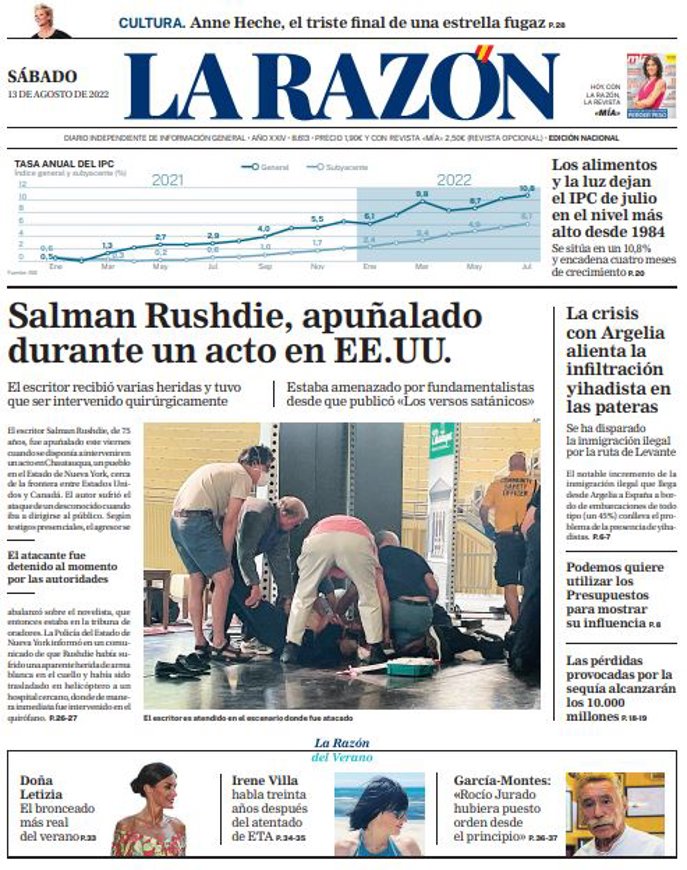 LA RAZÓN: "Salman Rushdie, apuñalado durante un acto en EE.UU."; "Los alimentos y la luz dejan el IPC de julio en el nivel más alto desde 1984"; "La crisis con Argelia alienta la infiltración yihadista en las pateras"; "Podemos quiere utilizar los Presupuestos para mostrar su influencia"; "Las pérdidas provocadas por la sequía alcanzarán los 10.000 millones".