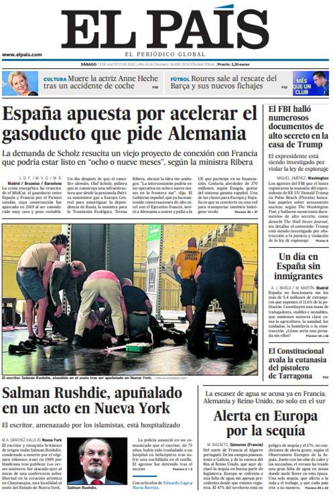 EL PAÍS: "España apuesta por acelerar el gasoducto que pide Alemania"; "Salman Rushdie, apuñalado en un acto en Nueva York. El escritor, amenazado por los islamistas, está hospitalizad"; "El FBI halló numerosos documentos de alto secreto en la casa de Trump"; "Un día en España sin inmigrantes"; "El Constitucional avala la eutanasia del pistolero de Tarragona"; "Alerta en Europa por la sequía".