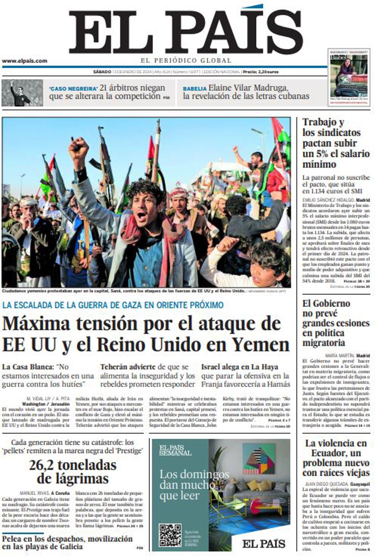EL PAÍS: "Máxima tensión por el ataque de EE UU y el Reino Unido en Yemen"; "6,2 toneladas de lágrimas"; "Trabajo y los sindicatos pactan subir un 5% el salario mínimo"; "El Gobierno no prevé grandes cesiones en política migratoria"; "La violencia en Ecuador, un problema nuevo con raíces viejas".