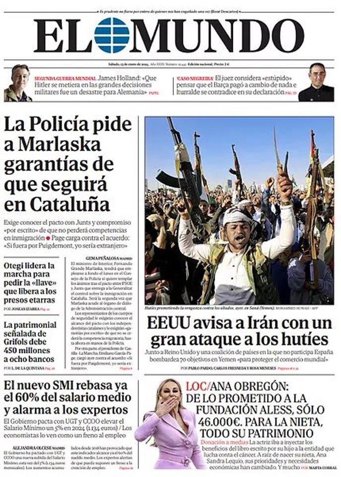 EL MUNDO: "La Policía pide a Marlaska garantías de que seguirá en Cataluña"; "Otegi lidera la marcha para pedir la "llave" que libera a los presos etarras"; "La patrimonial señalada de Grifols debe 450 millones a ocho bancos"; "El nuevo SMI rebasa ya el 60% del salario medio y alarma a los expertos"; "EEUU avisa a Irán con un gran ataque a los hutíes".