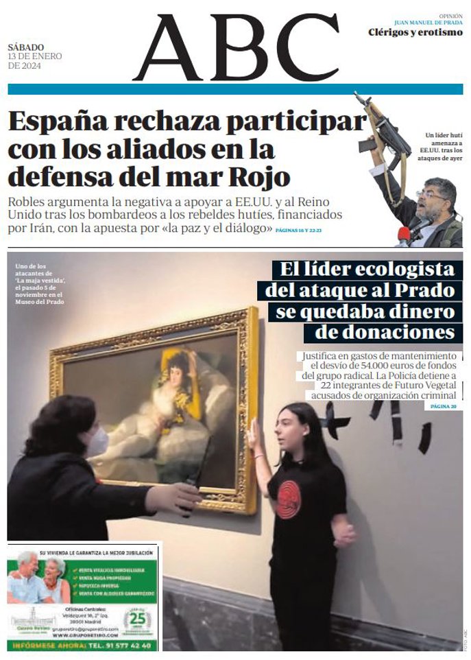 ABC: "España rechaza participar con los aliados en la defensa del mar Rojo"; "El líder ecologista del ataque al Prado se quedaba dinero de donaciones".