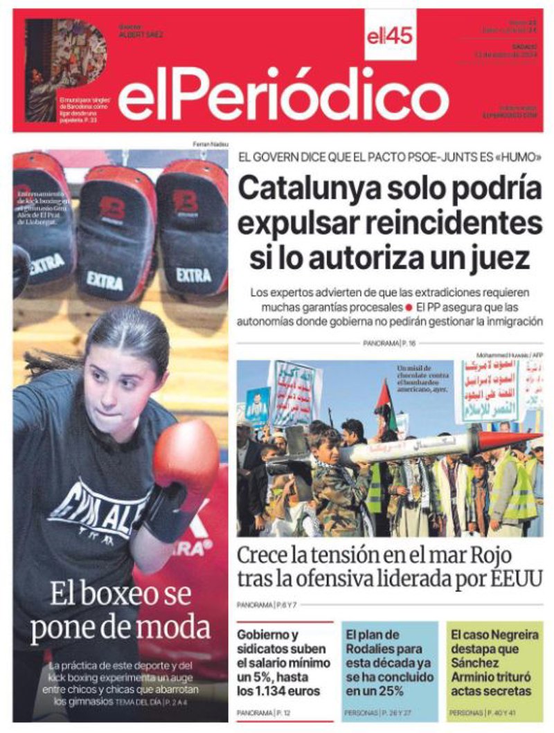 EL PERIÓDICO: "Catalunya solo podría expulsar reincidentes si lo autoriza un juez"; "Crece la tensión en el mar Rojo tras la ofensiva liderada por EEUU"; "Gobierno y sindicatos suben el salario mínimo un 5%, hasta los 1.134 euros": "El plan de Rodalíes para esta década ya se ha concluido en un 25%"; "El caso Negreira destapa que Sánchez Arminio trituró actas secretas".