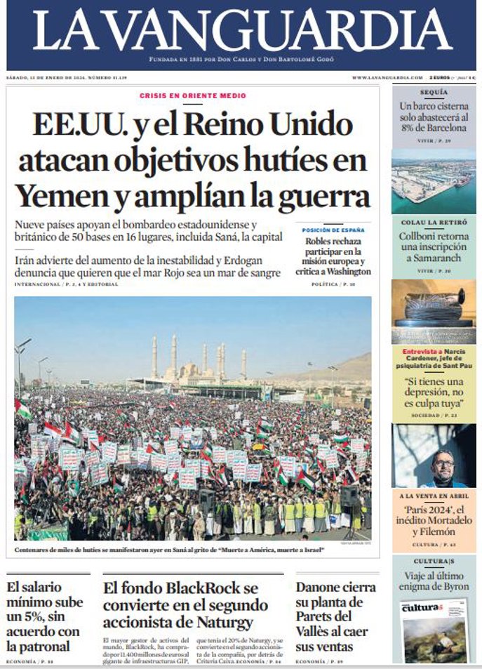 LA VANGUARDIA: "EEUU y el Reino Unido atacan objetivos hutíes en Yemen y amplían la guerra"; "El fondo BlackRock se convierte en el segundo accionista de Naturgy"; "El salario mínimo sube un 5%, sin acuerdo con la patronal"; "Danone cierra su planta de Parets del