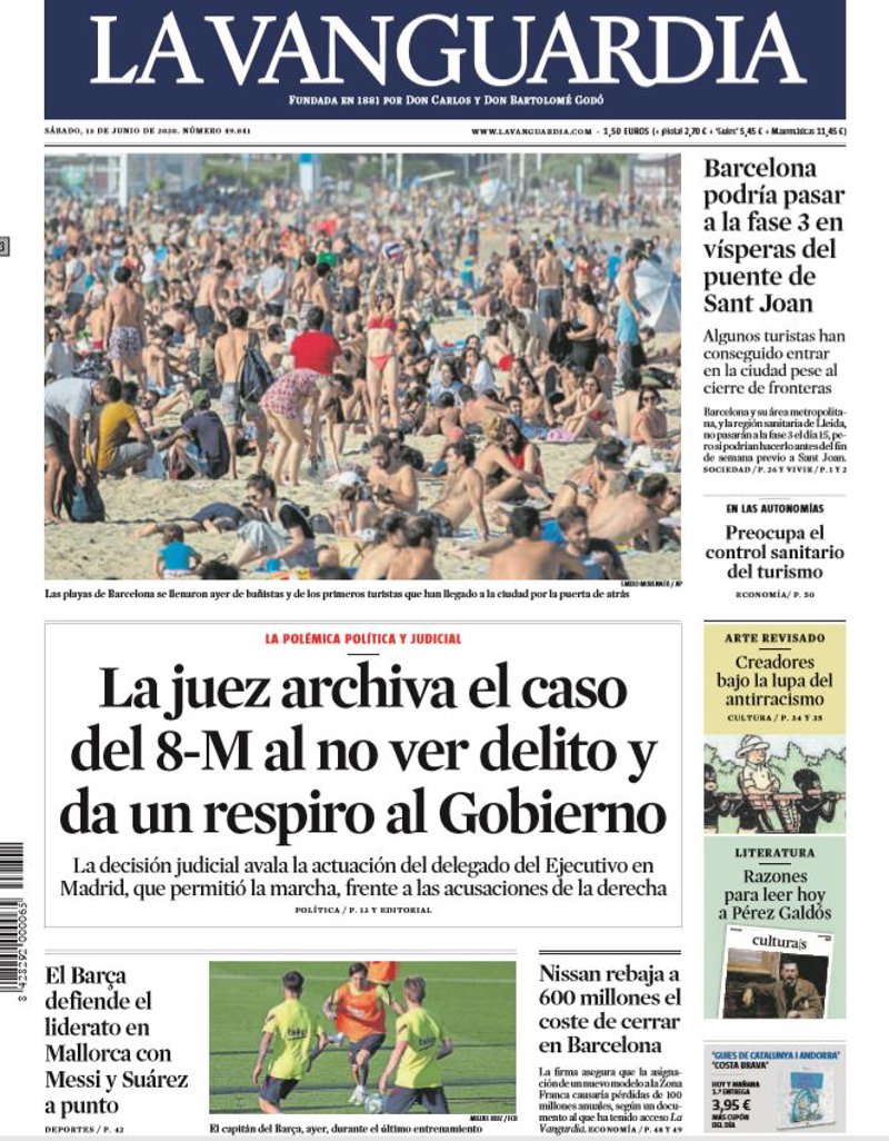 LA VANGUARDIA: "La juez archiva el caso del 8-M al no ver delito y da un respiro al Gobierno"; "Barcelona podría pasar a la fase 3 en vísperas del puente de Sant Joan"; "Preocupa el control sanitario del turismo"; "El Barça defiende el liderato en Mallorca con Messi y Suárez a punto"; "Nissan rebaja a 600 millones el coste de cerrar en Barcelona".