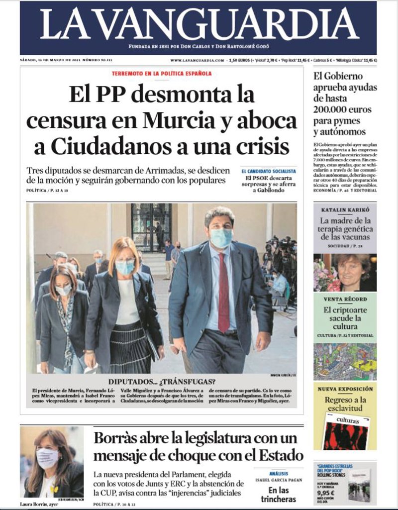 LA VANGUARDIA: "El PP desmonta la censura en Murcia y aboca a Ciudadanos a una crisis. El PSOE descarta sorpresas y se aferra a Gabilondo"; "Borràs abre la legislatura con un mensaje de choque con el Estado"; "El Gobierno aprueba ayudas de hasta 200.000 euros para pymes y autónomos".