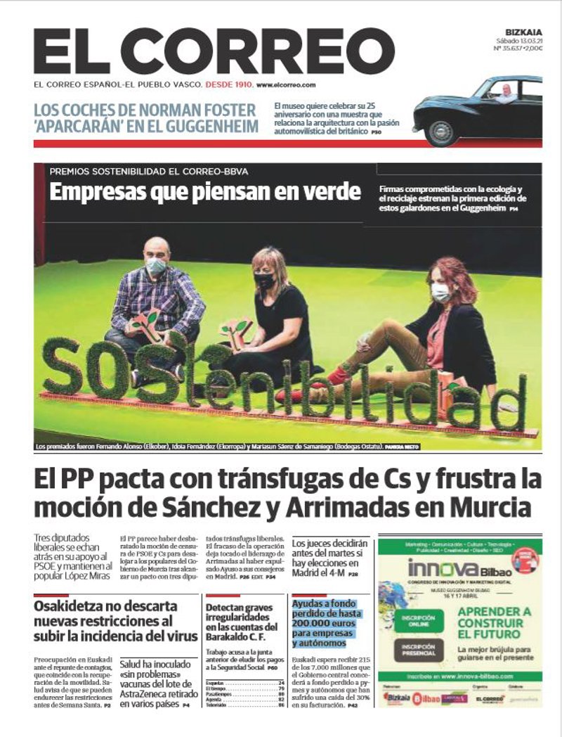 EL CORREO: "Empresas que piensan en verde. Firmas comprometidas con la ecología y el reciclaje estrenan la primera edición de estos galardones en el Guggenheim"; "El PP pacta con tránsfugas de Cs y frustra la moción de Sánchez y Arrimadas en Murcia"; "Osakidetza no descarta nuevas restricciones al subir la incidencia del virus"; "Detectan graves irregularidades en las cuentas del Barakaldo C. F."; "Ayudas a fondo perdido de hasta 200.000 euros para empresas y autónomos".