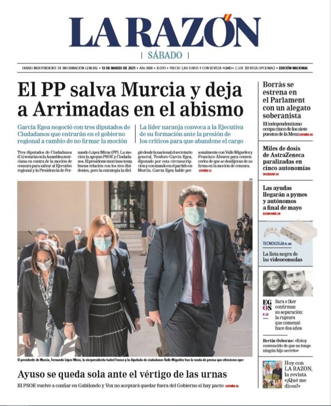 LA RAZÓN: "El PP salva Murcia y deja a Arrimadas en el abismo"; "Ayuso se queda sola ante el vértigo de las urnas"; "Borràs se estrena en el Parlament con un alegato soberanista"; "Miles de dosis de AstraZeneca paralizadas en cinco autonomías"; "Las ayudas llegarán a pymes y autónomos a final de mayo".