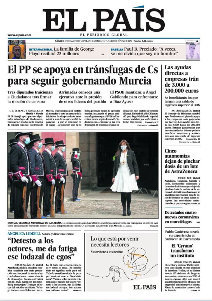 EL PAÍS: "El PP se apoya en tránsfugas de Cs para seguir gobernando Murcia"; "Borràs, segunda autoridad de Cataluña"; "Angelica Liddell, autora y directora teatral: "Detesto a los actores, me da fatiga ese lodazal de egos""; "Las ayudas directas a empresas irán de 3.000 a 200.000 euros"; "Cinco autonomías dejan de pinchar dosis de un lote de AstraZeneca"; "Detectados cuatro nuevos coronavirus en murciélagos"; "El 'Cyrano' transformó un instituto".