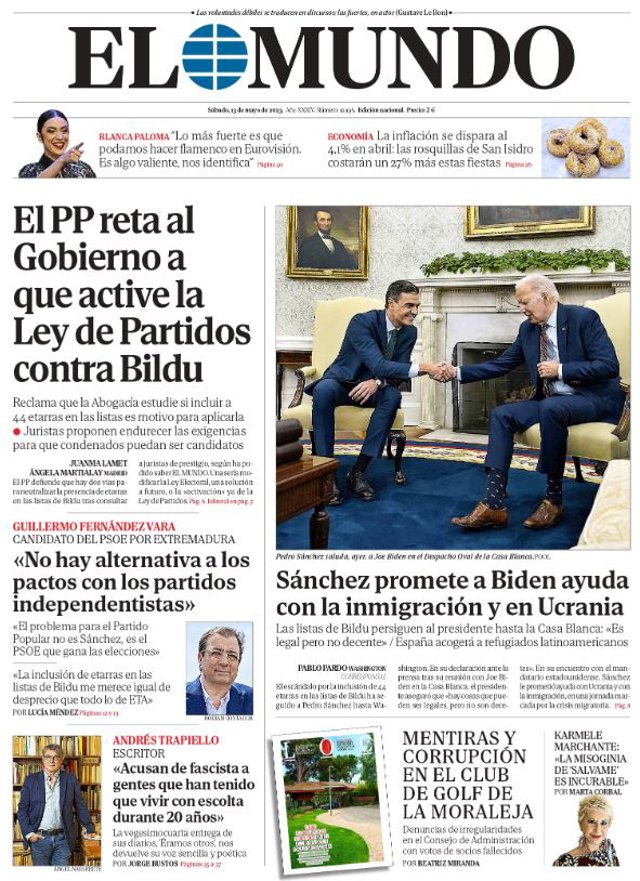 EL MUNDO: "El PP reta al Gobierno que active la Ley de Partidos contra Bildu": "Guillermo Fernández Vara: "No hay alternativa a los pactos con los partidos independentistas""; "Sánchez promete a Biden ayuda con la inmigración y en Ucrania"".