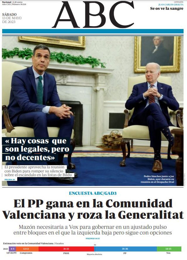 ABC: ""Hay cosas que son legales, pero no decentes". El presidente aprovecha la reunión con Biden para romper su silencio sobre el escándalo en las listas de Bildu"; "El PP gana en la Comunidad Valenciana y roza la Generalitat. Mazón necesitaría a Vox para gobernar en un ajustado pulso entre bloques en el que la izquierda baja pero sigue con opciones".