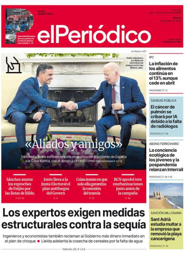 EL PERIÓDICO: ""Aliados y amigos"; "Los expertos exigen medidas estructurales contra la sequía"; "La inflación de los alimentos continúa en el 13% aunque cede en abril"; "El cáncer de pulmón se cribará por IA debido a la falta de radiólogos"; "La conciencia ecológica de los jóvenes y la pospandemia relanzan Interrail"; "Sant Adrià estudia multar a la empresa que removió la playa cancerígena".