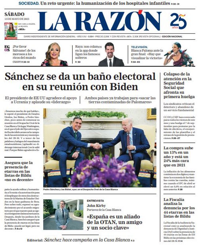LA RAZÓN: "Sánchez se da un baño electoral en su reunión con Biden"; "Colapso de la atención en la Seguridad Social que afronta su primera huelga"; "La compra sube un 13% en un año y está un 24% más cara que en 2021"; "La Fiscalía analiza la denuncia por los 44 etarras en las listas de Bildu".