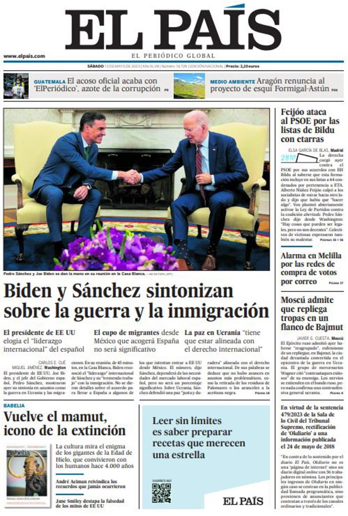 EL PAÍS: "Biden y Sánchez sintonizan sobre la guerra y la inmigración"; "Feijóo ataca al PSOE por las listas de Bildu con etarras"; "Alarma en Melilla por las redes de compra de votos por correo"; "Moscú admite que repliega tropas en un flanco de Bajmut"; "