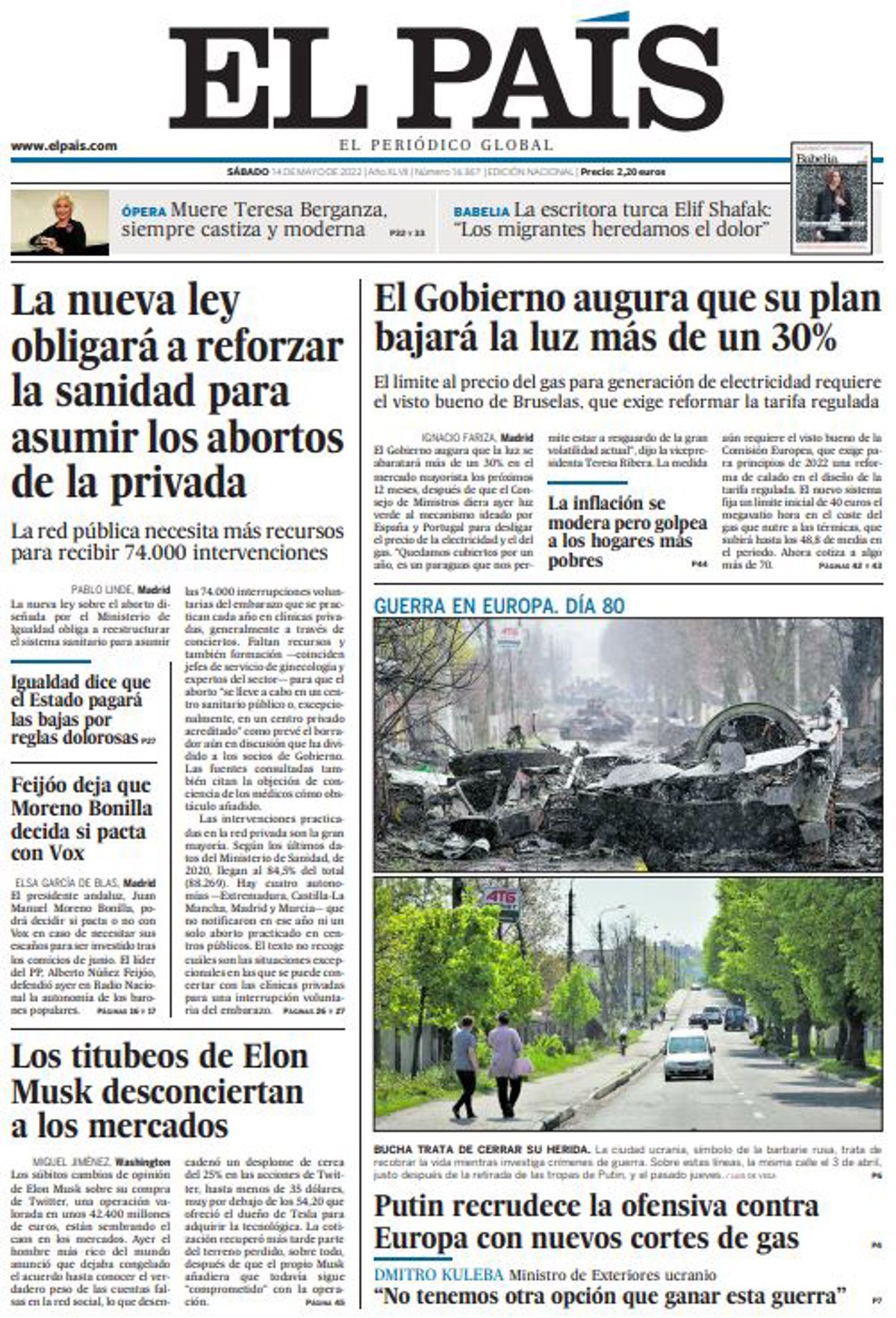EL PAÍS: "La nueva ley obligará a reforzar la sanidad para asumir los abortos de la privada"; "El Gobierno augura que su plan bajará la luz más de un 30%"; "Putin recrudece la ofensiva contra Europa con nuevos cortes de gas"; "Los titubeos de Elon Musk desconciertan a los mercados"; "Igualdad dice que el Estado pagará las bajas por
