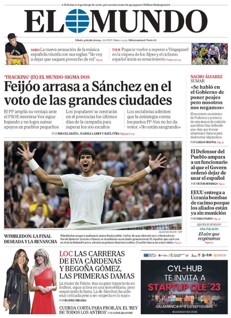 EL PERIÓDICO: "Feijóo plantea un final de campaña para gobernar en solitario"; "Inmenso Alcaraz"; "El nudismo pierde fuelle en las playas"; "Meritxell Batet: "Hay que ampliar el diálogo abierto en Catalunya"; "Las olas de calor extremo colapsan los centros de fauna protegida"; "Catalunya incorpora una flota de drones para controlar mejor tráfico".