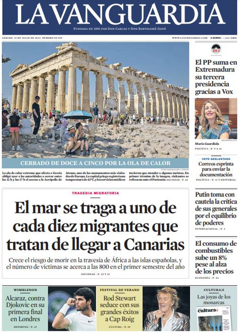 LA VANGUARDIA: "El mar se traga a uno de cada diez migrantes que tratan de llegar a Canarias"; "El PP suma en Extremadura su tercera presidencia gracias a Vox"; "Putin toma con cautela la crítica de sus generales por el equilibrio de poderes"; "El consumo de combustibles sube un 8% pese al alza de los precios".