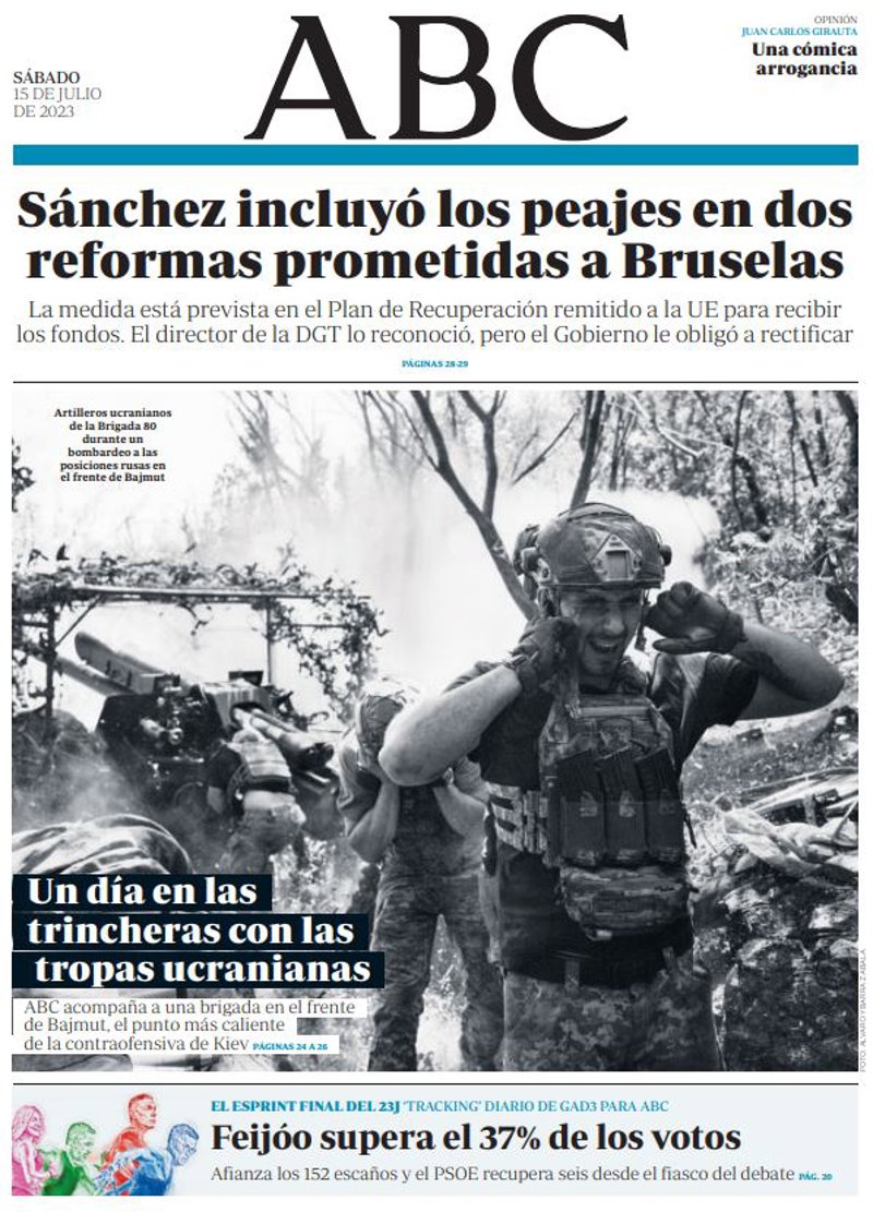 ABC: "Sánchez incluyó los peajes en dos reformas prometidas a Bruselas. La medida está prevista en el Plan de Recuperación remitido a la UE para recibir los fondos. El director de la DGT lo reconoció, pero el Gobierno le obligó a rectificar"; "Un día en las trincheras con las tropas ucranianas"; "Feijóo supera el 37% de los votos".