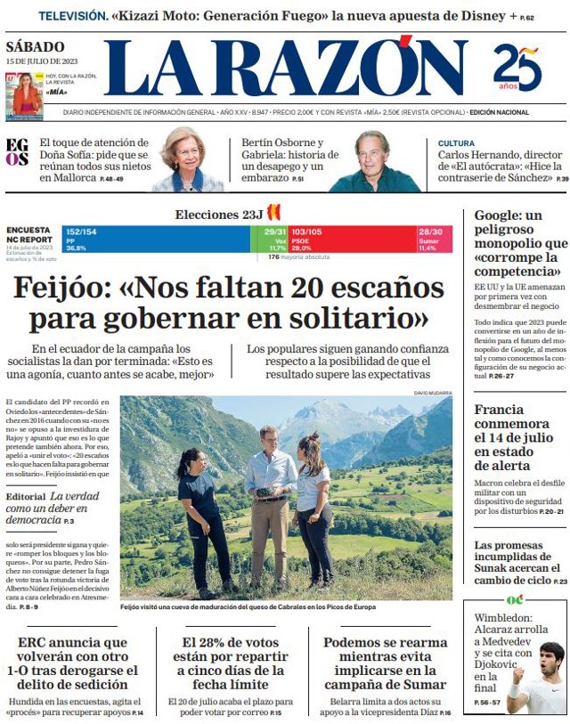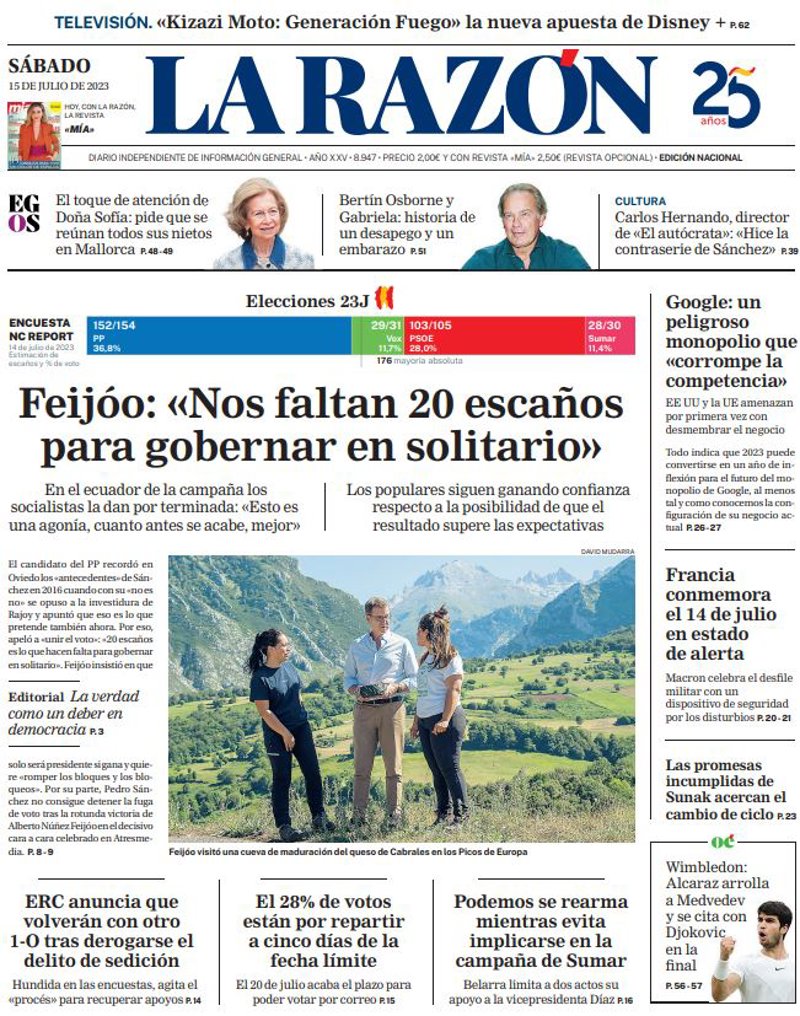 LA RAZÓN: "Feijóo: "Nos faltan 20 escaños para gobernar en solitario""; "ERC anuncia que volverán con otro 1-O tras derogarse el delito de sedición"; "El 28% de votos están por repartir a cinco días de la fecha límite"; "Podemos se rearma mientras evita implicarse en la campaña de Sumar"; "Google: un peligroso monopolio que "corrompe la competencia""; "Francia conmemora el 14 de julio en estado de alerta"; "Las promesas incumplidas de Sunak acercan el cambio de ciclo".