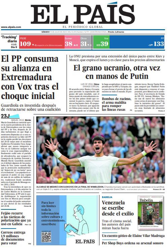 EL PAÍS: "El PP consuma su alianza en Extremadura con Vox tras el choque inicial"; "El grano ucranio, otra vez en manos de Putin"; "Feijóo recurre desde el exilio a las tácticas de polarización que ya usó en Galicia"; "Correos entrega 1,9 millones de documentos para votar".
