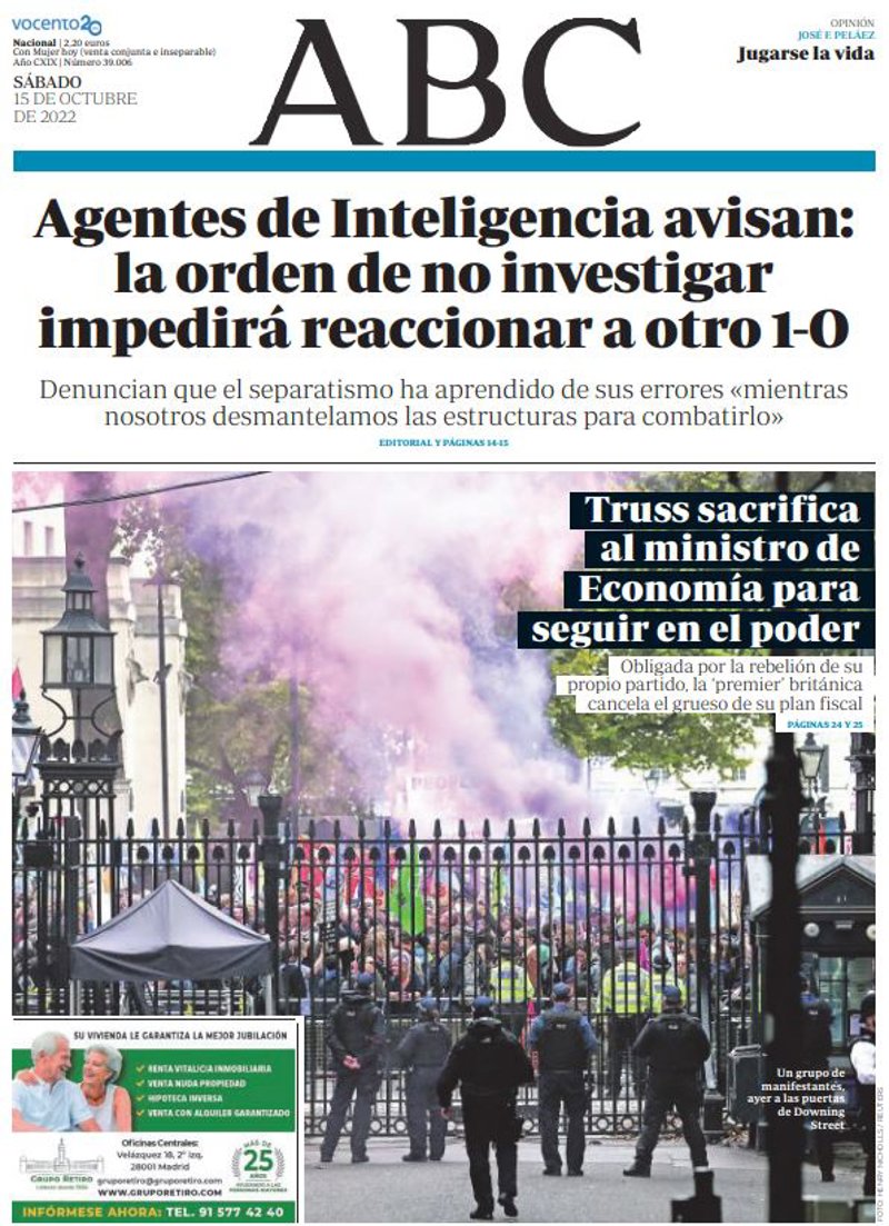 ABC: "Agentes de Inteligencia avisan: la orden de no investigar impedirá reaccionar a otro 1-O Denuncian que el separatismo ha aprendido de sus errores "mientras nosotros desmantelamos las estructuras para combatirlo""; "Truss sacrifica al ministro de Economía para seguir en el poder".