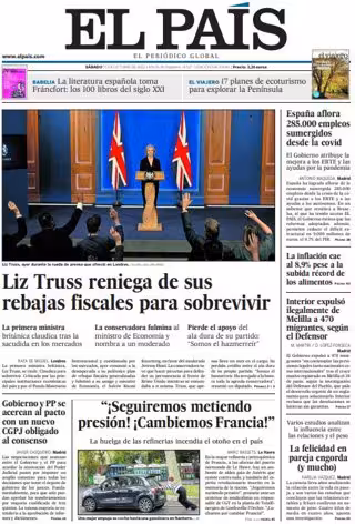 EL PAÍS: "Liz Truss reniega de sus rebajas fiscales para sobrevivir"; ""¡Seguiremos metiendo presión! ¡Cambiemos Francia!""; "Gobierno y PP se acercan al pacto con un nuevo CGPJ obligado al consenso"; "España aflora 285.000 empleos sumergidos desde la covid"; "La inflación cae al 8,9% pese a la subida récord de los alimentos"; "Interior expulsó ilegalmente de Melilla a 470 migrantes, según el Defensor"; "La felicidad en pareja engorda (y mucho)".