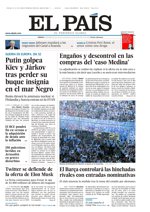 EL PAÍS: "Putin golpea Kiev y Járkov tras perder su buque insignia en el mar Negro"; "Engaños y descontrol en las compras del 'caso Medina'; "Twitter se defiende de la oferta de Elon Musk"; "El Barça controlará las hinchadas rivales con entradas nominativas".