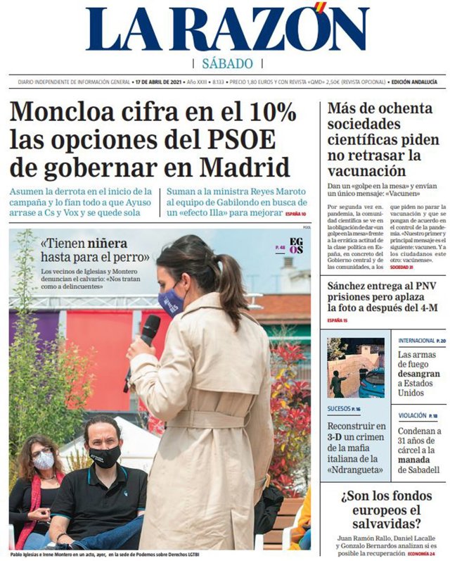 LA RAZÓN: "Moncloa cifra en el 10% las opciones del PSOE de gobernar en Madrid"; ""Tienen niñera hasta para el perro". Los vecinos de Iglesias y Montero denuncian el calvario: "Nos tratan como a delincuentes""; "Más de ochenta sociedades científicas piden no retrasar la vacunación"; "Sánchez entrega al PNV prisiones pero aplaza la foto a después del 4-M"; "Reconstruir en 3-D un crimen de la mafia italiana de la "Ndrangueta""; "Las armas de fuego desangran a Estados Unidos"; "Condenan a 31 años de cárcel a la manada de Sabadell"; "¿Son los fondos europeos el salvavidas?".