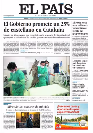 EL PAÍS: "El Gobierno promete un 25% de castellano en Cataluña"; "La supervivencia del lince ibérico. Hace 15 años no llegaban a un centenar los linces ibéricos en libertad en España. Hoy, son más de 500 gracias al éxito de los programas de recuperación"; "Eduardo Arroyo. Mirando los cuadros de mi vida"; "El PSOE veta a su militante Valenciano al frente del grupo europeo"; "Leopoldo López pide boicotear las elecciones en Venezuela".